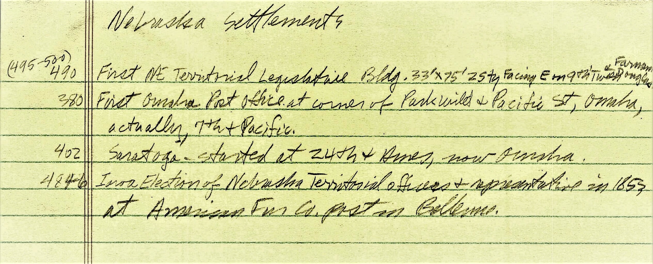 The note lists historical details about Nebraska settlements, including the first territorial legislative building, the first Omaha post office, Saratoga's location, and an election of Nebraska territorial officers.